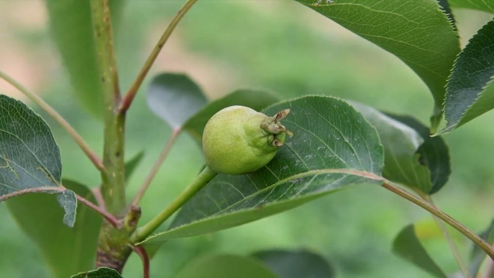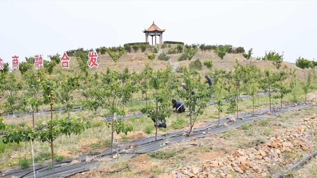 在淄博市沂源县鲁村镇龙子峪村酥梨园,工作人员在进行夏季管护。几年前这里还是一座荒山,2022年,沂源桃花岛农业发展有限公司流转了这片山地,改造为酥梨园。