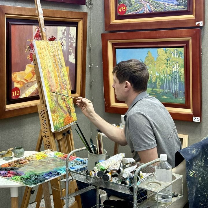 一名俄罗斯青年油画家在位于黑河市大黑河岛的中俄油画城创作(3月21日摄)。