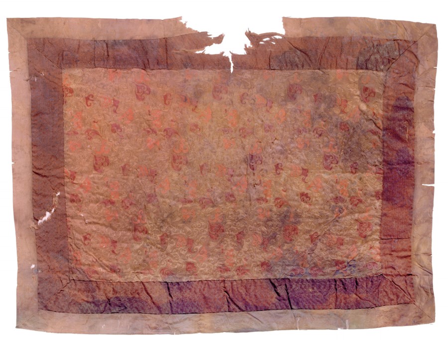 湖南博物院马王堆汉墓及藏品研究展示中心主任、研究馆员喻燕姣介绍,辛追墓中出土的随葬品部分有遣册或木牌登记名录,绢地“乘云绣”枕巾出土时覆盖在药枕上,为双层的绢地“乘云绣”面,周缘镶以几何纹绒圈锦和淡黄色绢,里层为素绢。有遣册记之为“乘云绣枕巾”。而绮地“乘云绣”被发现时压在了一件夹袍的下方。