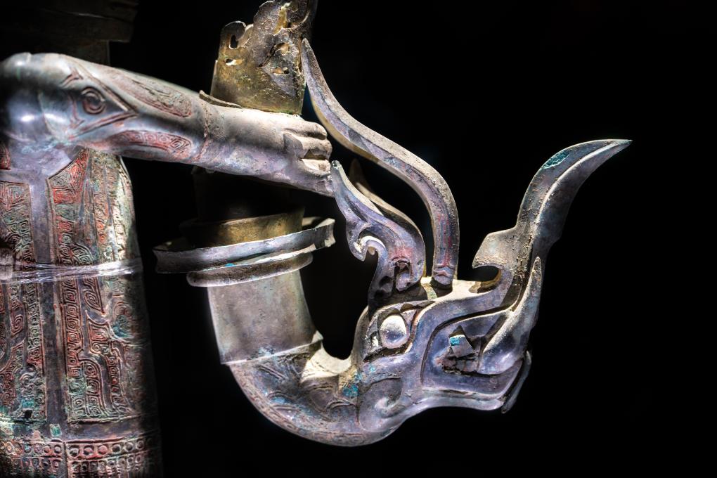 这是2024年1月26日在三星堆博物馆拍摄的三星堆青铜鸟足神像上的青铜龙头杖形器局部。新华社记者 薛晨 摄