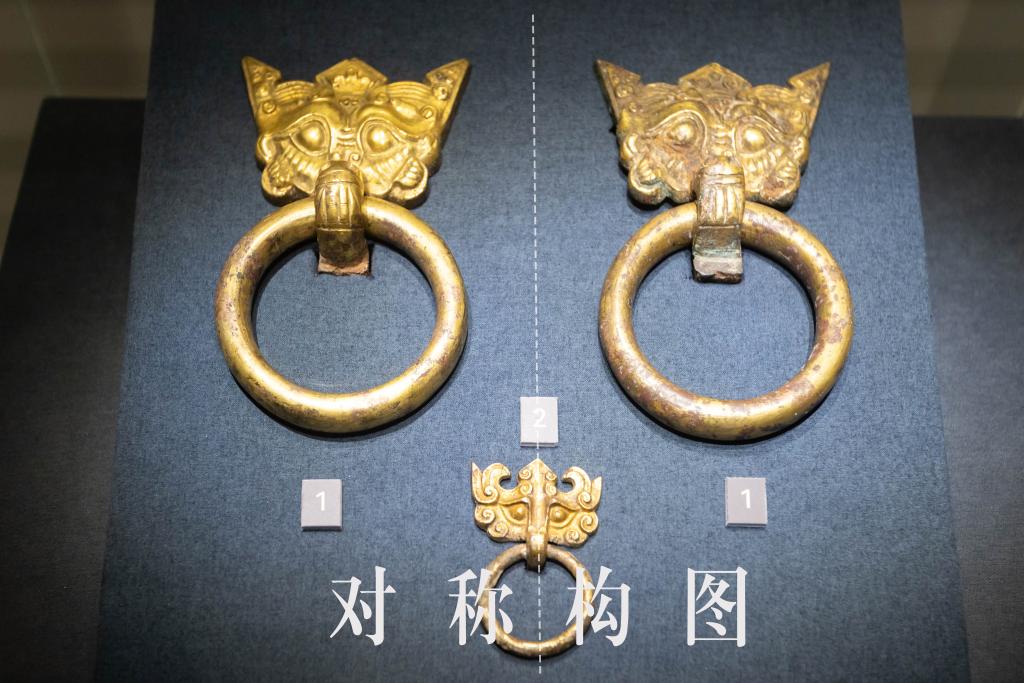 这是2024年6月25日在上海市闵行区博物馆“大汉未央——汉代王室精品文物展”上拍摄的鎏金铜铺首。新华社记者 王翔 摄