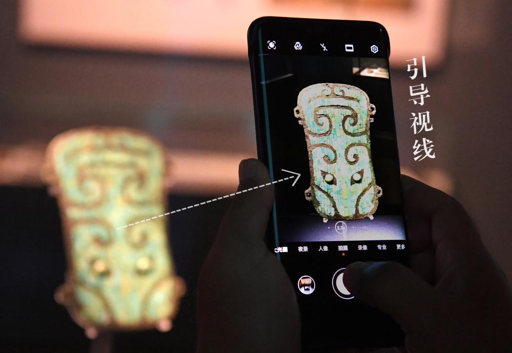 2022年9月4日,参观者在郑州博物馆文翰街馆“繁星盈天——中国百年百大考古发现展”上拍摄展品“镶嵌绿松石兽面纹铜牌饰”。新华社记者 李安 摄