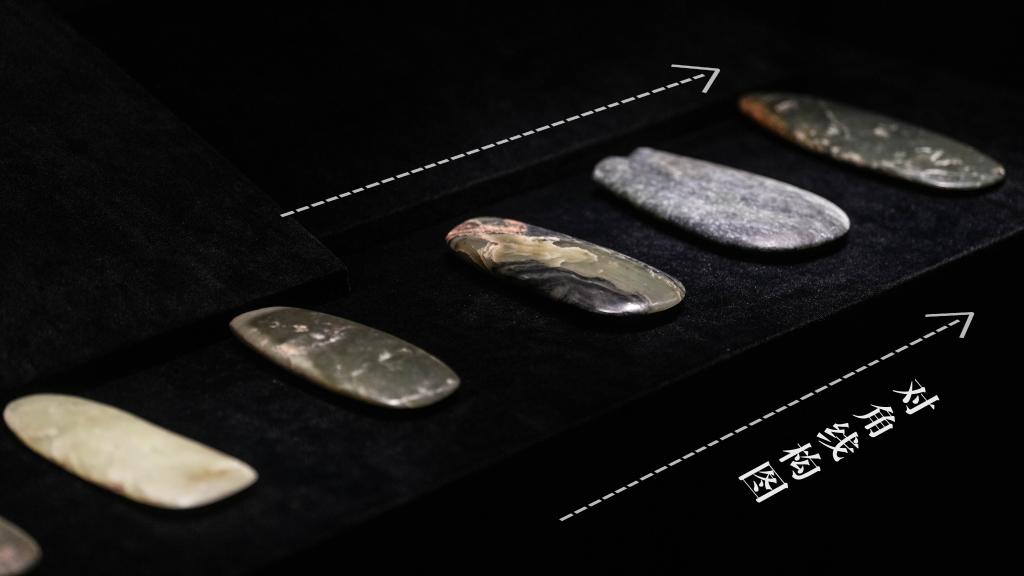 这是2024年8月3日在牛河梁遗址博物馆拍摄的展品玉斧。新华社记者 潘昱龙 摄