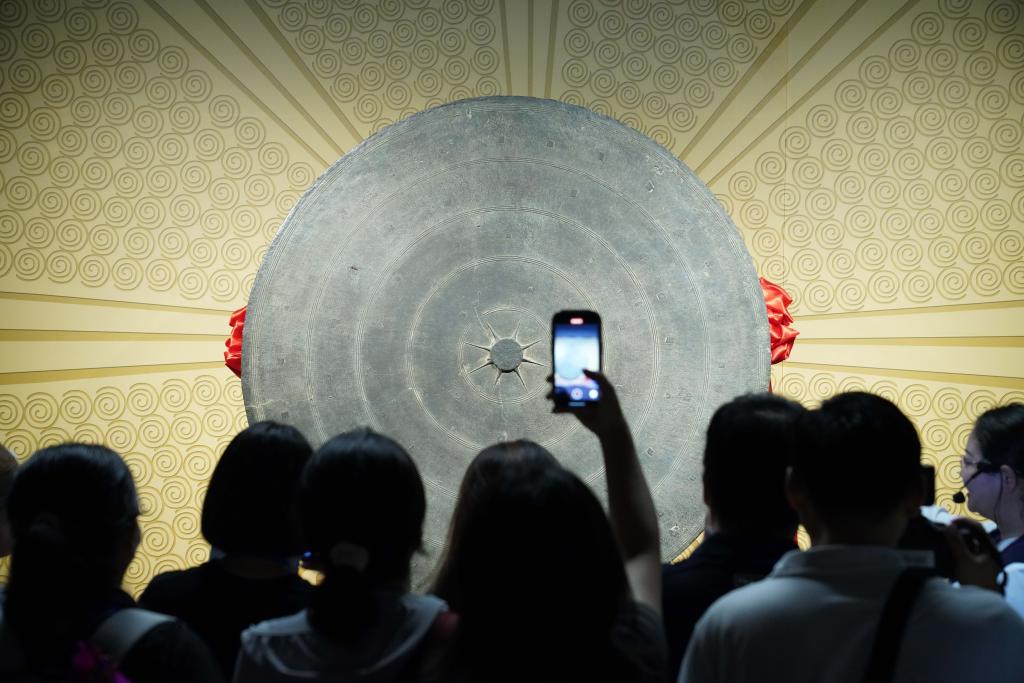 2024年8月24日,人们在广西民族博物馆“壮族文化展”参观镇馆之宝——云雷纹大铜鼓。新华社记者 尹栋逊 摄