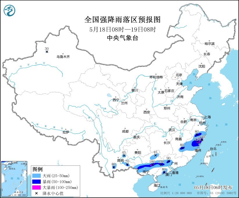 预计,5月18日08时至19日08时,浙江南部、江西东南部、福建中北部、云南东南部、广西中部和东北部、广东中西部等地部分地区有大到暴雨,其中,浙江东南部、福建东北部、广西中东部、广东西部等地部分地区有大暴雨(100~180毫米)。上述部分地区伴有短时强降水(最大小时降雨量30~60毫米,局地可超过80毫米)等强对流天气。