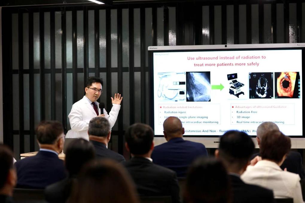 5月18日,中国医学科学院阜外医院副院长潘湘斌教授向来访的联合国代表团介绍超声引导经皮介入技术。新华社记者 方思贤 摄