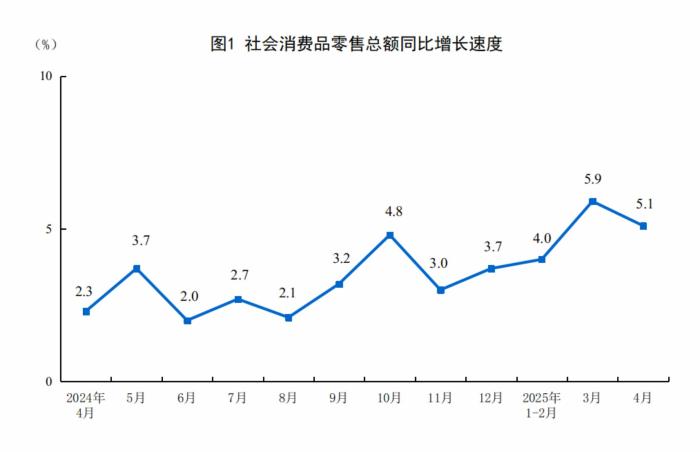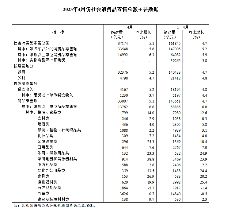 据国家统计局网站消息,4月份,社会消费品零售总额37174亿元,同比增长5.1%。其中,除汽车以外的消费品零售额33548亿元,增长5.6%。1—4月份,社会消费品零售总额161845亿元,增长4.7%。其中,除汽车以外的消费品零售额147005亿元,增长5.2%。