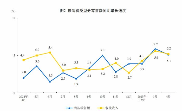 按消费类型分,4月份,商品零售额33007亿元,同比增长5.1%;餐饮收入4167亿元,增长5.2%。1—4月份,商品零售额143651亿元,增长4.7%;餐饮收入18194亿元,增长4.8%。