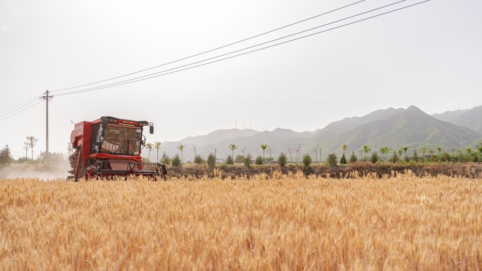 5月18日上午,一台联合收割机在山西省运城市盐湖区西姚村的麦田里作业。新华社发(兰立强摄)