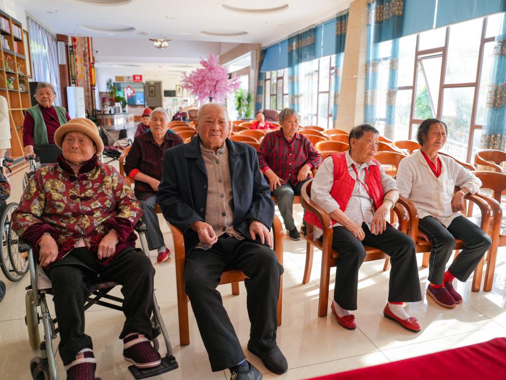 ↑在四川省南充市五福堂颐养院,刘寿山(前排左二)与老人们一起看电视(4月9日摄)。