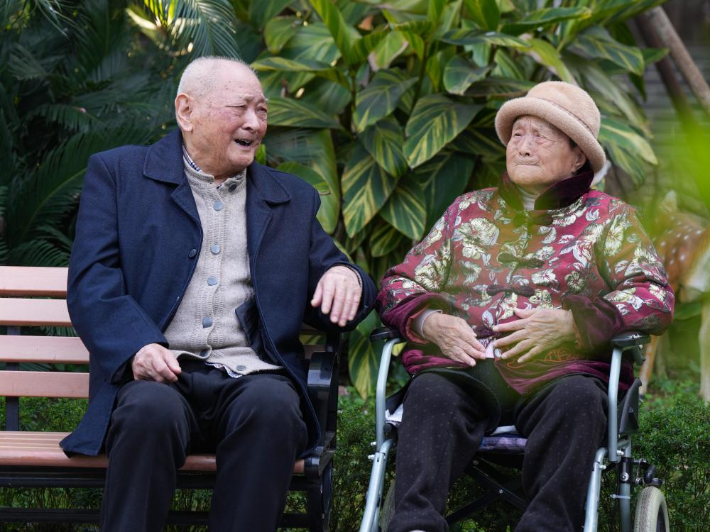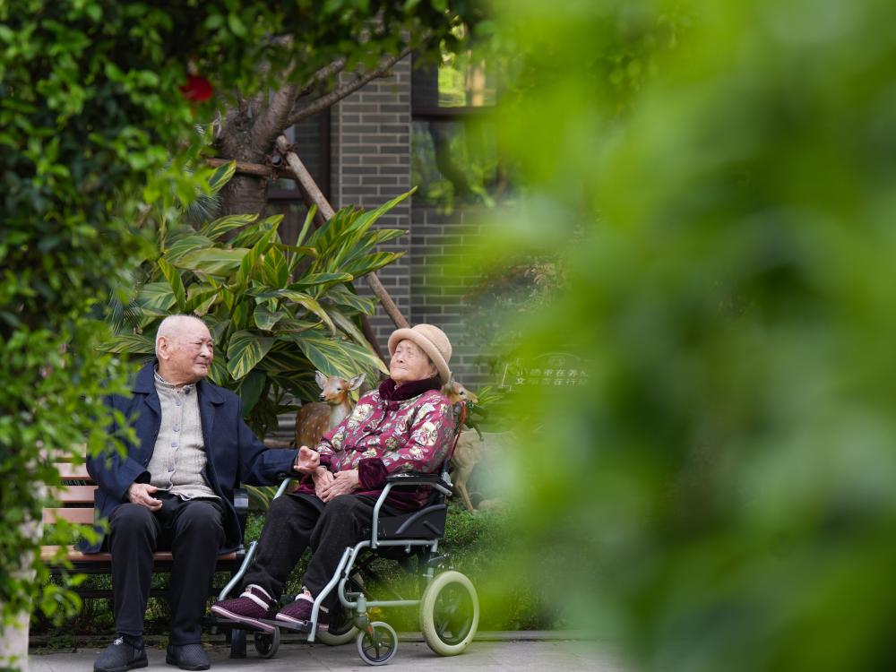 ↑刘寿山(左)和妻子杨宗菊在四川省南充市五福堂颐养院聊天(4月9日摄)。