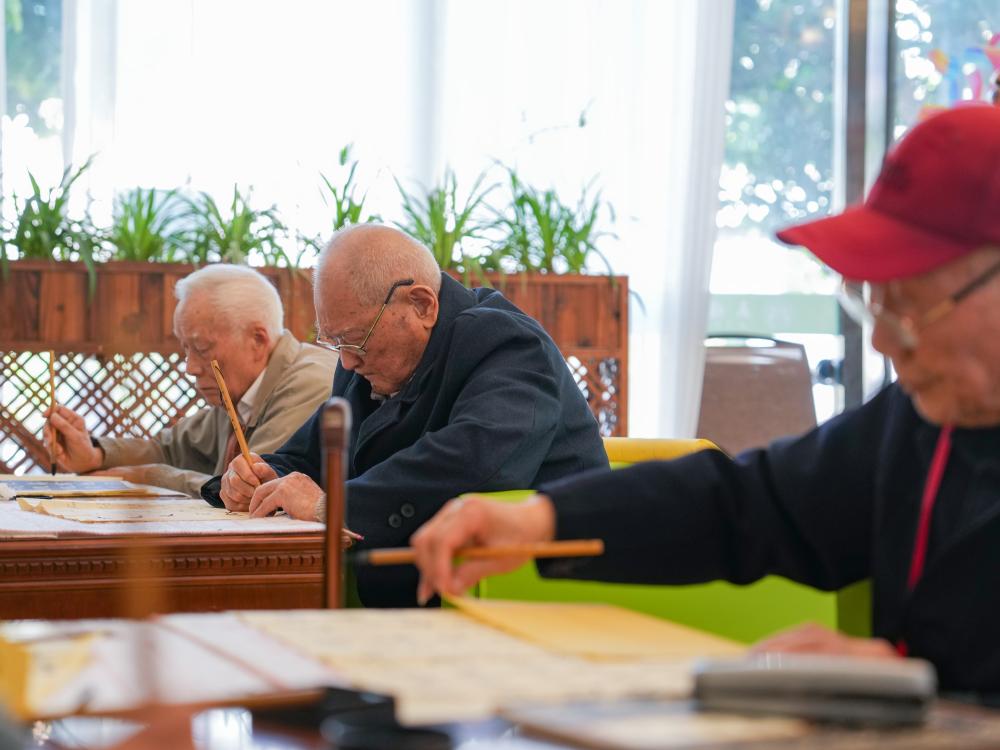 ↑刘寿山(中)在四川省南充市五福堂颐养院练习书法(4月9日摄)。