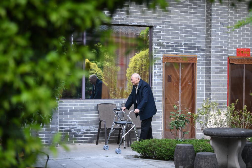 ↑刘寿山在四川省南充市五福堂颐养院散步(4月9日摄)。