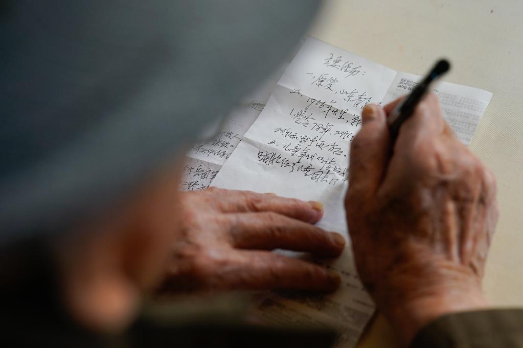 ↑刘寿山用笔写下自己的人生经历(4月9日摄)。