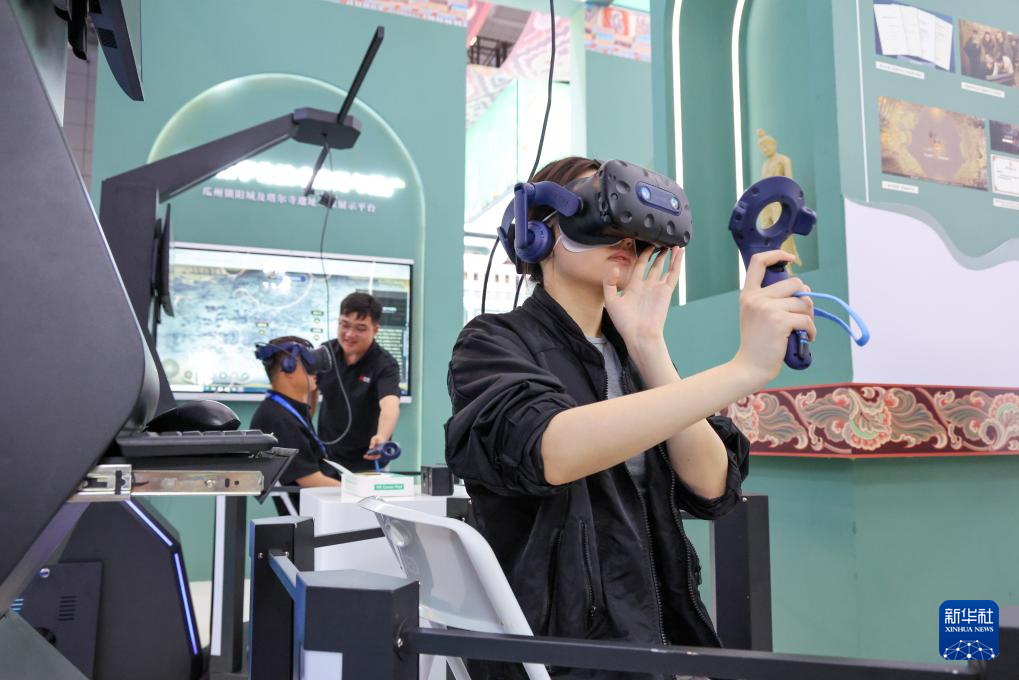 5月22日,观众在文博会甘肃展台体验VR游敦煌。新华社记者 梁旭 摄