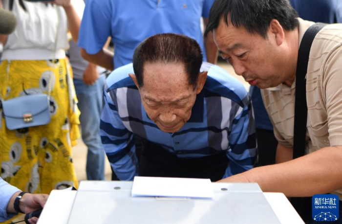 2017年9月29日,袁隆平在位于湖南湘潭的低镉稻实验田边查看水稻镉含量的检测结果。新华社记者 薛宇舸 摄