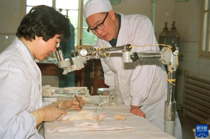 1989年,吴孟超(右)和学生孙君泓在一起进行大鼠原位肝移植动物实验。 新华社记者 王子瑾 摄