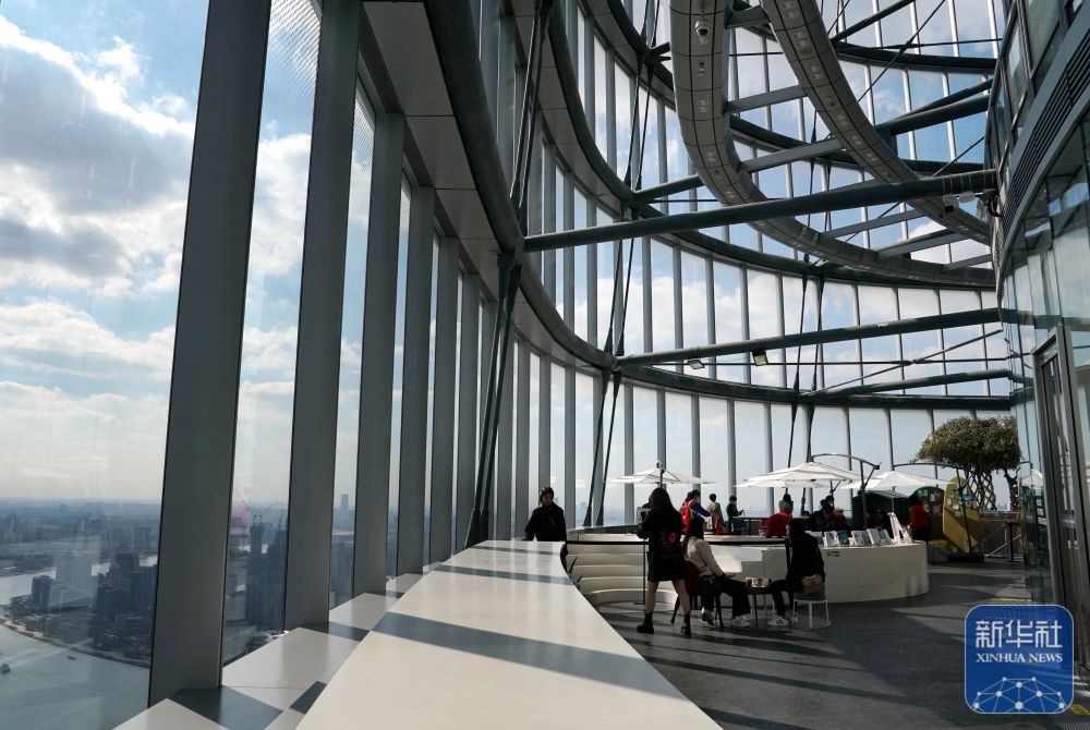 2020年11月12日拍摄的朵云书院观景台。有“云端书店”之称的朵云书院位于上海中心大厦52层。顾客在这里可以“抬头看云,低头读书”,并俯瞰黄浦江两岸美景。