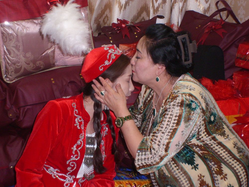 在位于乌鲁木齐市的家中,母亲亲吻即将启程前往阿勒泰新郎家的买迪娜。(受访者供图)
