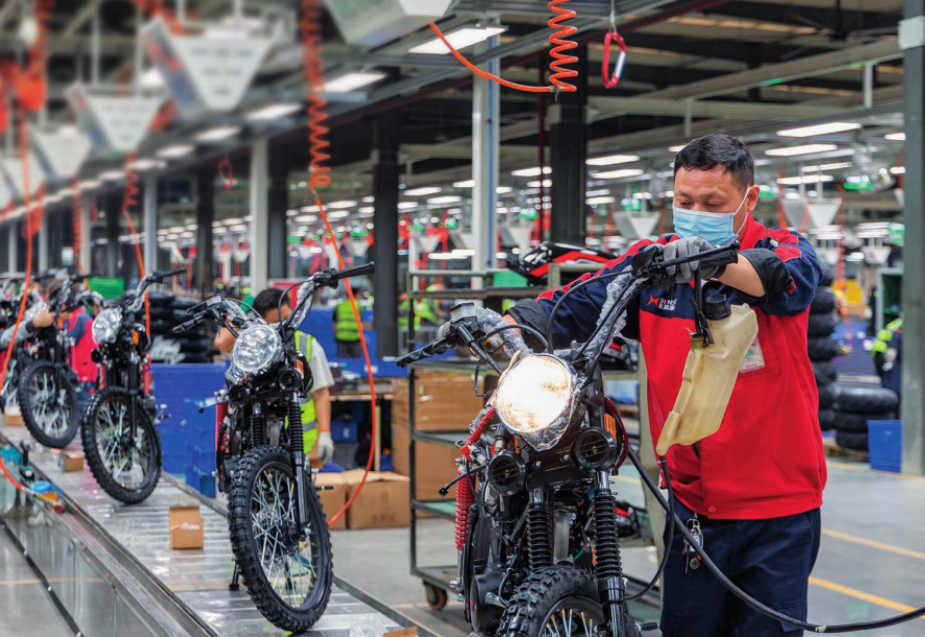 在位于重庆高新区的重庆鑫源摩托车股份有限公司工厂内,工作人员在生产线 上组装出口至巴西的摩托车(2024年11月13日摄)黄伟摄/本刊