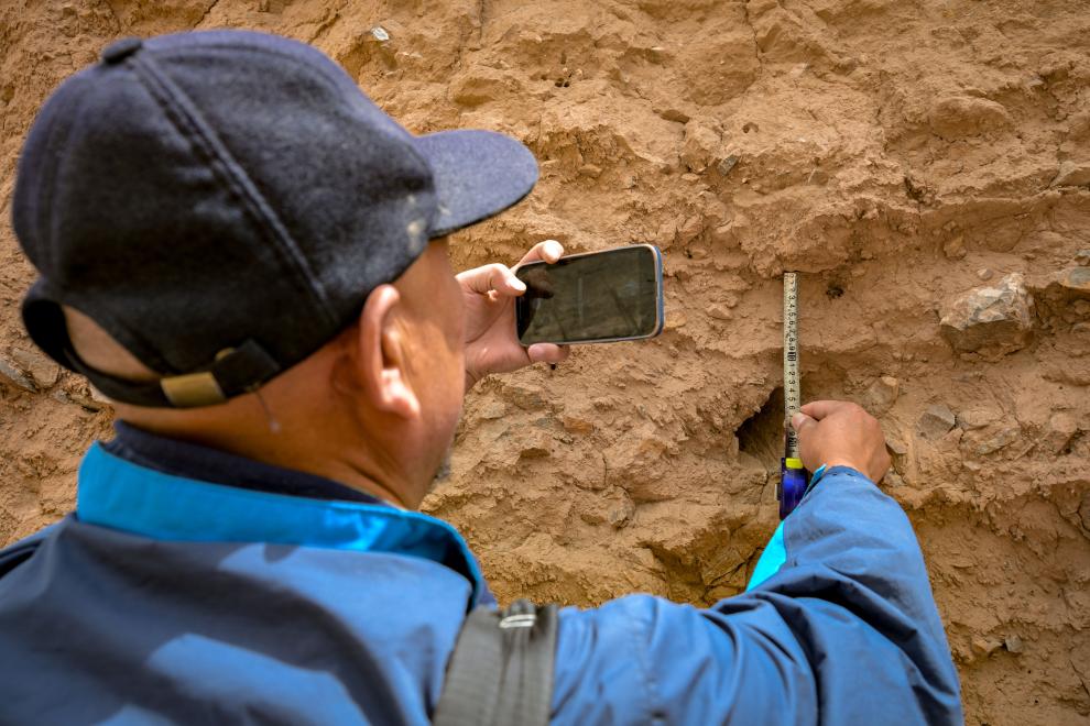 5月13日,李世翔在黄河黑山峡考察途中测量一处秦长城夯土层。