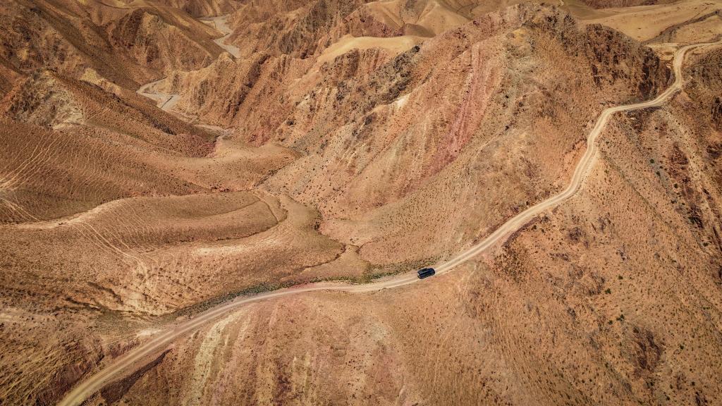 5月13日,李世翔驾车前往黄河黑山峡考察途中经过一段崎岖的山路(无人机照片)。