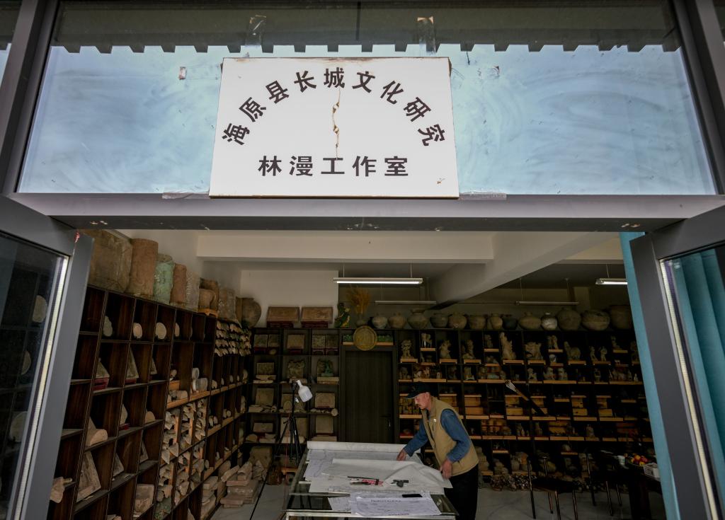 5月12日,李世翔在海原县博物馆旁的工作室中整理图纸(林漫是他的笔名)。