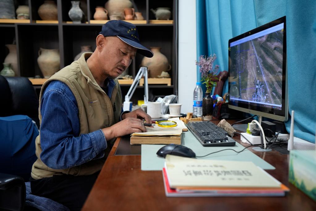 5月12日,李世翔在工作室参考古籍,标记他实地考察的一处古城遗址。
