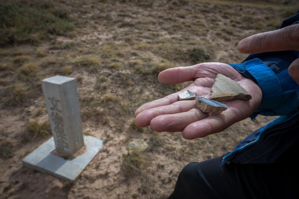 5月12日,李世翔展示散落在甯韦堡附近的瓷片。