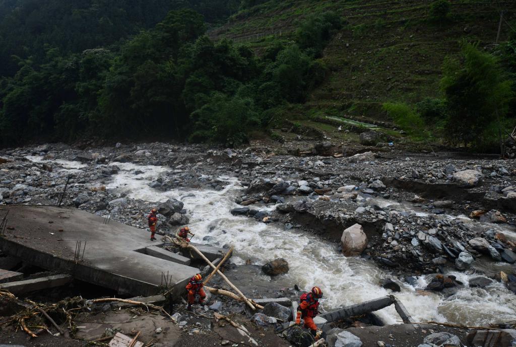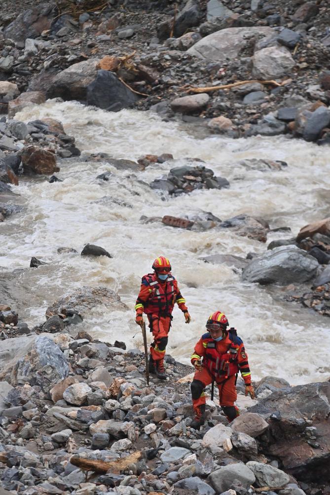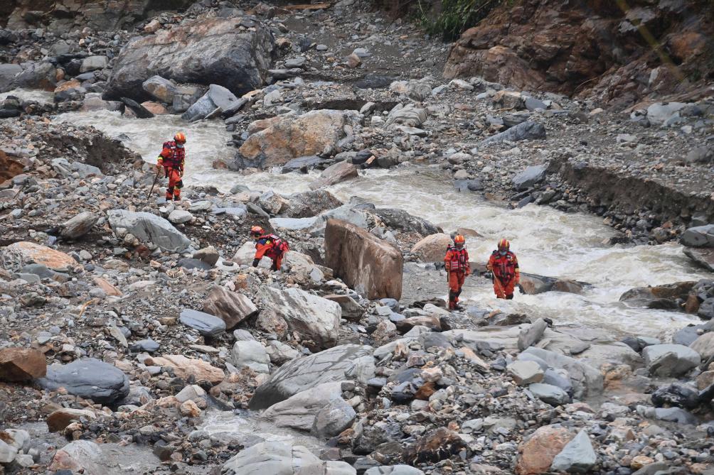 搜救人员正携带搜救犬、生命探测仪沿河道开展拉网式搜救;救护车辆和医务人员在岸边随时待命;电力工人准备应急设备供电。各方救援力量在现场协同作战,不停忙碌。