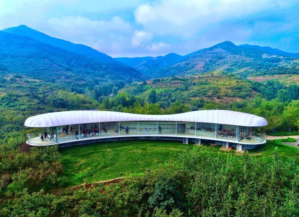 顺着蜿蜒的小路拾级而上,峰回路转之间,记者见到这个“网红书房”的全貌:白色的膜结构屋顶,透明的玻璃落地窗,流线型的外立面设计,九女峰书房宛如白云停留山间。室内延续素雅基调,弧形书墙与阶梯式平台错落有致,长廊串联咖啡区和阅读区。三五游客或品茗阅读,或凭窗远眺,尽享山间静谧。