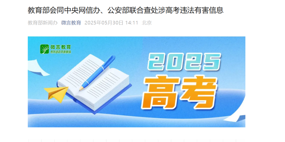 2025年高考在即。为积极营造风清气正的全国高考网络环境,根据国家教育统一考试工作部际联席会议部署,教育部会同中央网信办、公安部联合开展查处涉高考违法有害信息等工作。