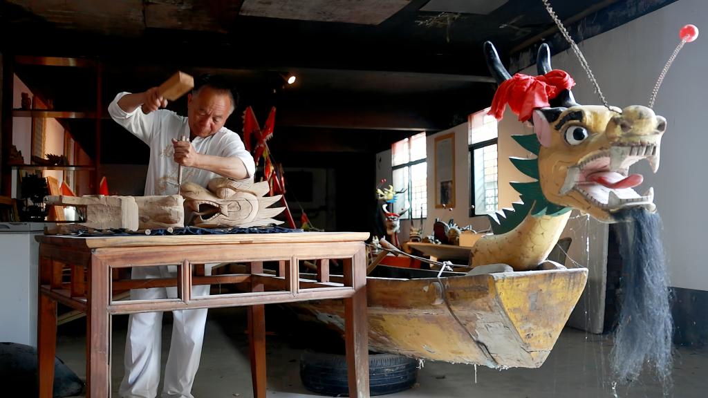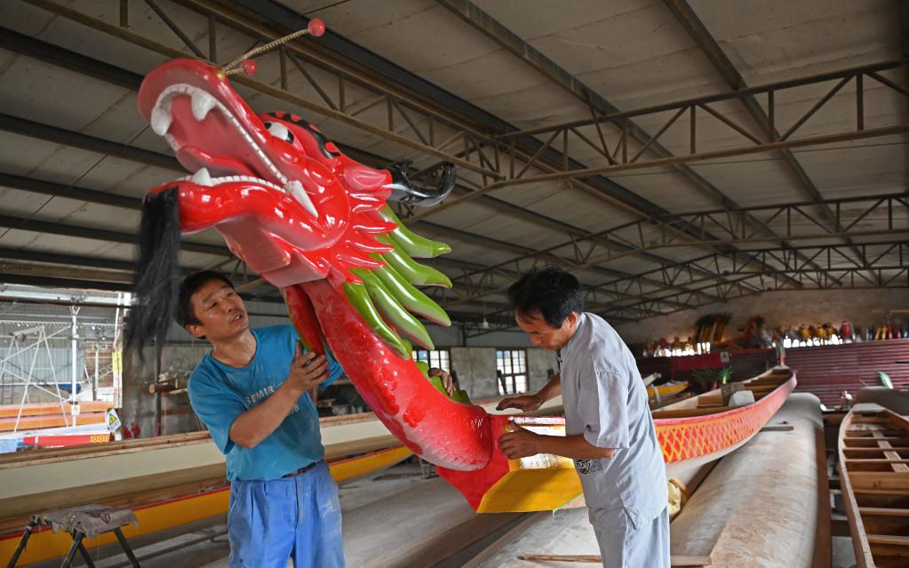 ↑汨罗市屈子祠镇九子龙屈原龙舟厂内,两名工人一起给龙舟安装龙头。新华社记者 李尕 摄水中的龙舟竞渡带动了岸上的“龙舟经济”