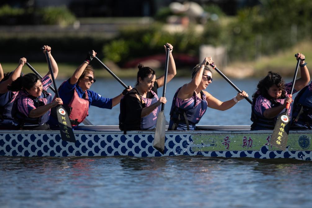 ↑2025年5月24日,人们在南非开普敦参加第三届“文化中国·开普敦龙舟节”的1500米龙舟竞速赛。新华社记者 王雷 摄