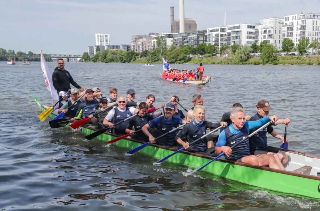 ↑2025年5月24日,人们在德国法兰克福美因河上参加第二届法兰克福国际龙舟友谊赛。新华社记者 张帆 摄