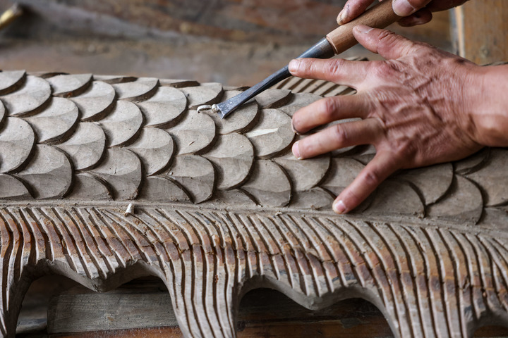 ↑2025年5月20日,贵州镇远县“龙舟制作”非遗传承人李启发在雕刻龙尾。李启发采用“吊、借、嵌”等传统工艺,结合现代力学改良,展现千年龙舟的“成形记”。 新华社记者 欧东衢摄