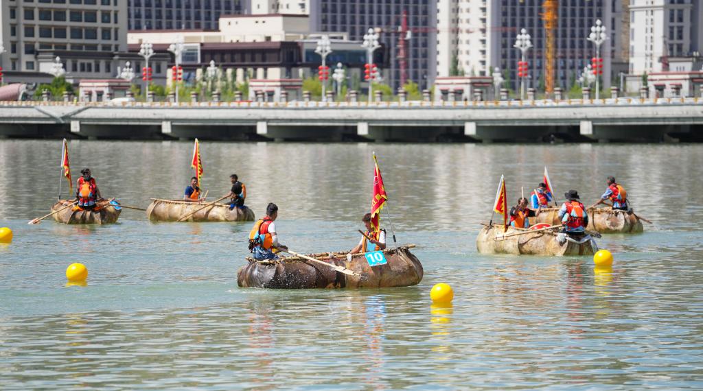 ↑5月31日,在拉萨市滨河公园旁的水域内,西藏自治区端午节牛皮船(龙舟)赛举行。新华社记者 晋美多吉 摄