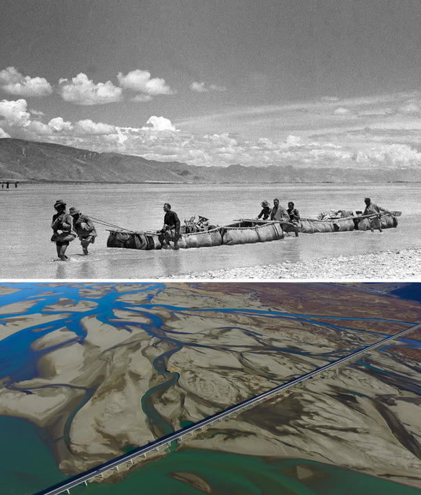 ↑拼版照片:上图是20世纪50年代,雅鲁藏布江上游的牛皮船载着土特产和粮食沿江运输至西藏东部(新华社发赵奇摄);下图是2016年12月11日拍摄的位于西藏山南市扎囊县境内的扎囊特大桥(新华社记者 普布扎西 摄)。