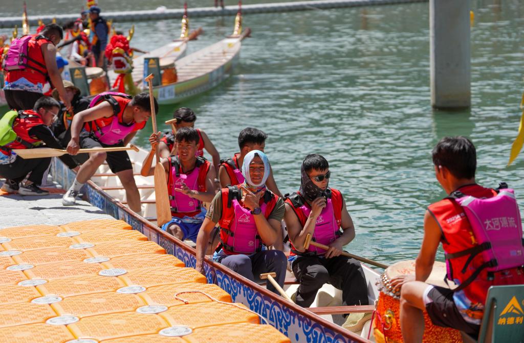 ↑5月31日,在拉萨市滨河公园旁的水域内,选手们正在准备出发。新华社记者 晋美多吉 摄
