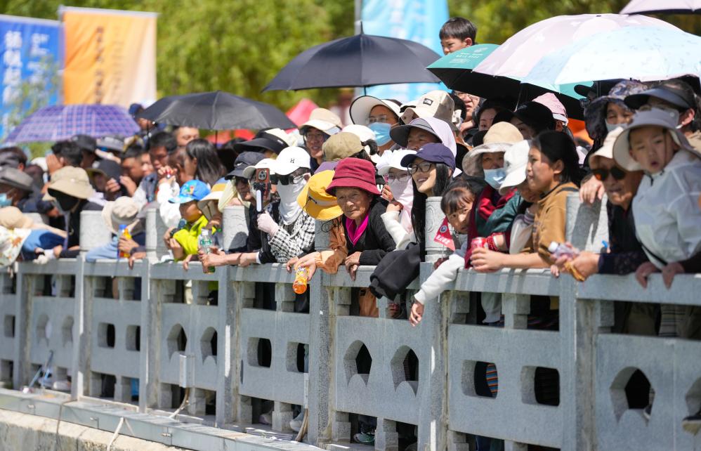 ↑5月31日,观众在拉萨市滨河公园岸边观看西藏自治区端午节牛皮船(龙舟)赛。新华社记者 晋美多吉 摄