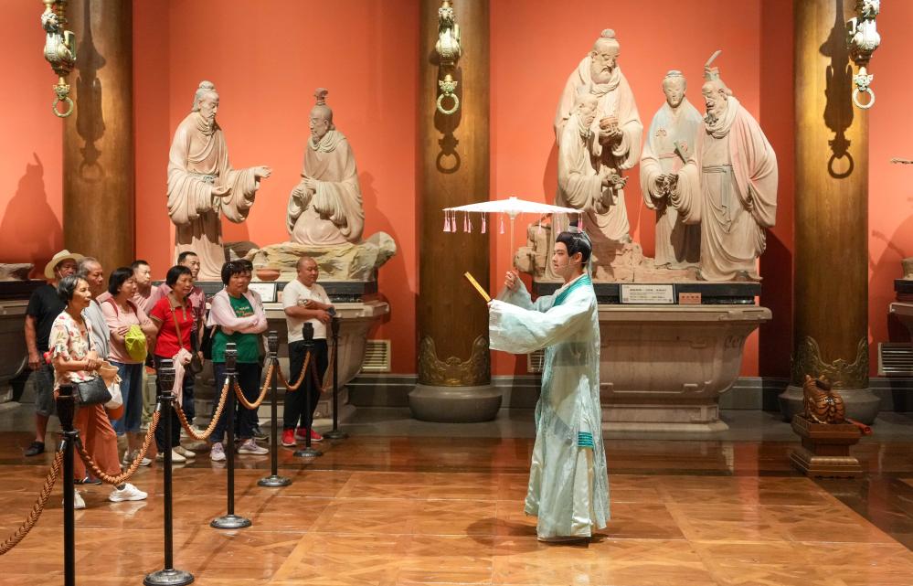 游客在尼山圣境景区与演员互动(2025年5月21日摄)。新华社记者 徐速绘 摄