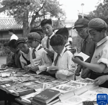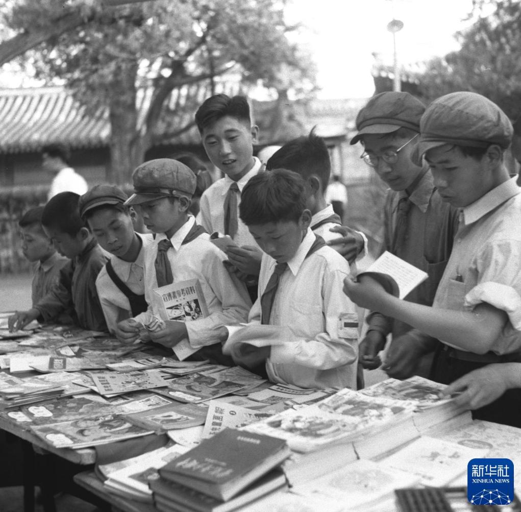 1951年,北京市中山公园内新华书店售书亭为了庆祝六一国际儿童节,为儿童准备了大批儿童读物。图为儿童们在选购儿童读物。新华社记者 郑小箴 摄