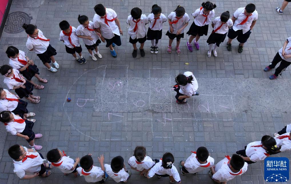2017年5月31日,河北省邯郸市丛台小学的学生玩“跳房子”游戏。新华社发(郝群英 摄)