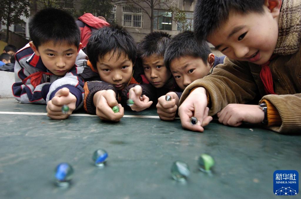 2007年12月18日,南京市长江路小学的孩子们一起玩打弹子游戏。新华社记者 孙参 摄