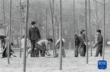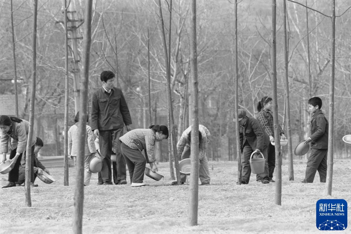 1982年,北京市少先队员在辅导员的带领下,提水浇树,为城市绿化作贡献。新华社记者 王建民 摄