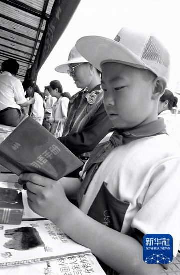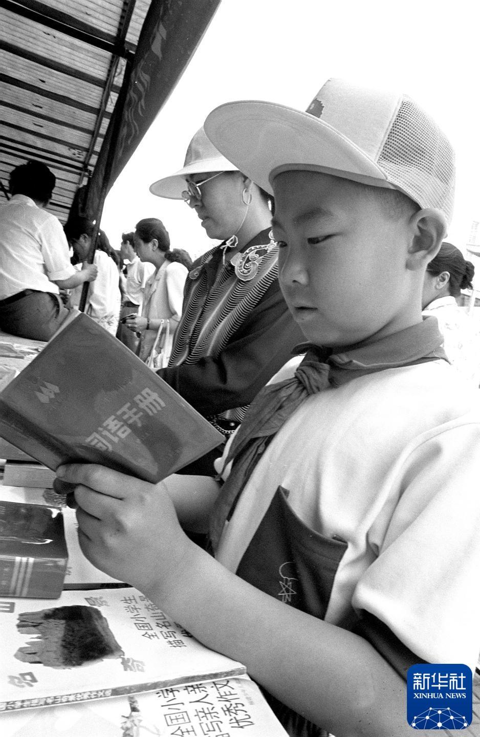 1996年,内蒙古呼和浩特市小学生在新华书店的书摊前选购自己喜欢的课外书。新华社记者 王晔彪 摄