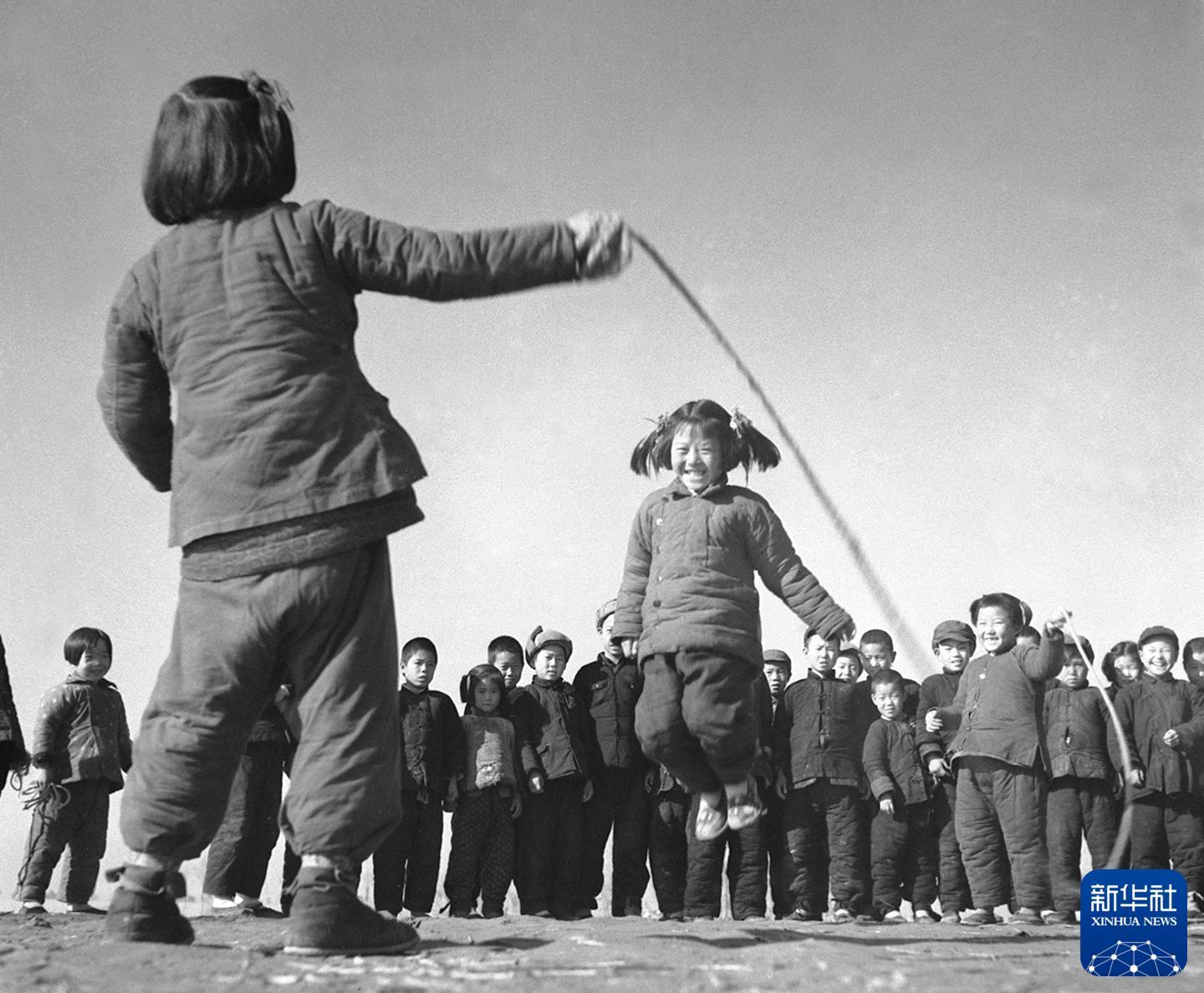 1956年12月,河北省高阳县邢果庄村的小学生们在空地上跳绳。新华社发