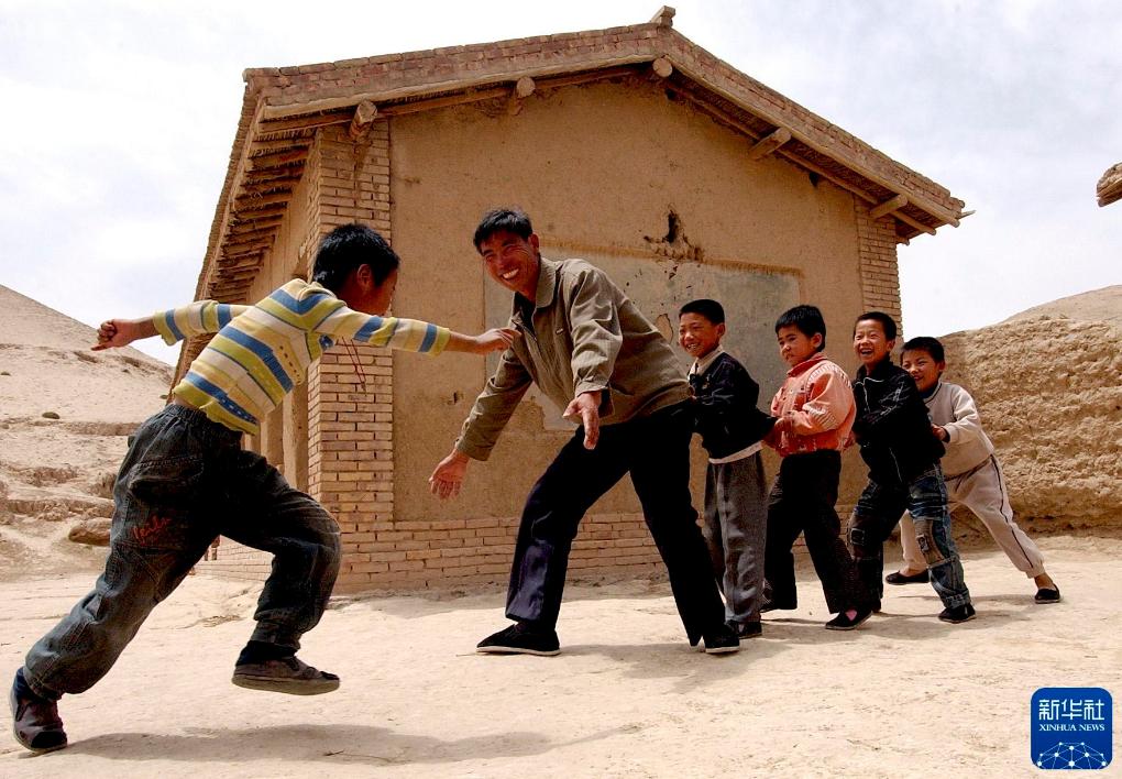 2007年5月25日,甘肃省靖远县高崖村阎寨教学点的老师和孩子们一起玩老鹰捉小鸡。新华社记者 聂建江 摄