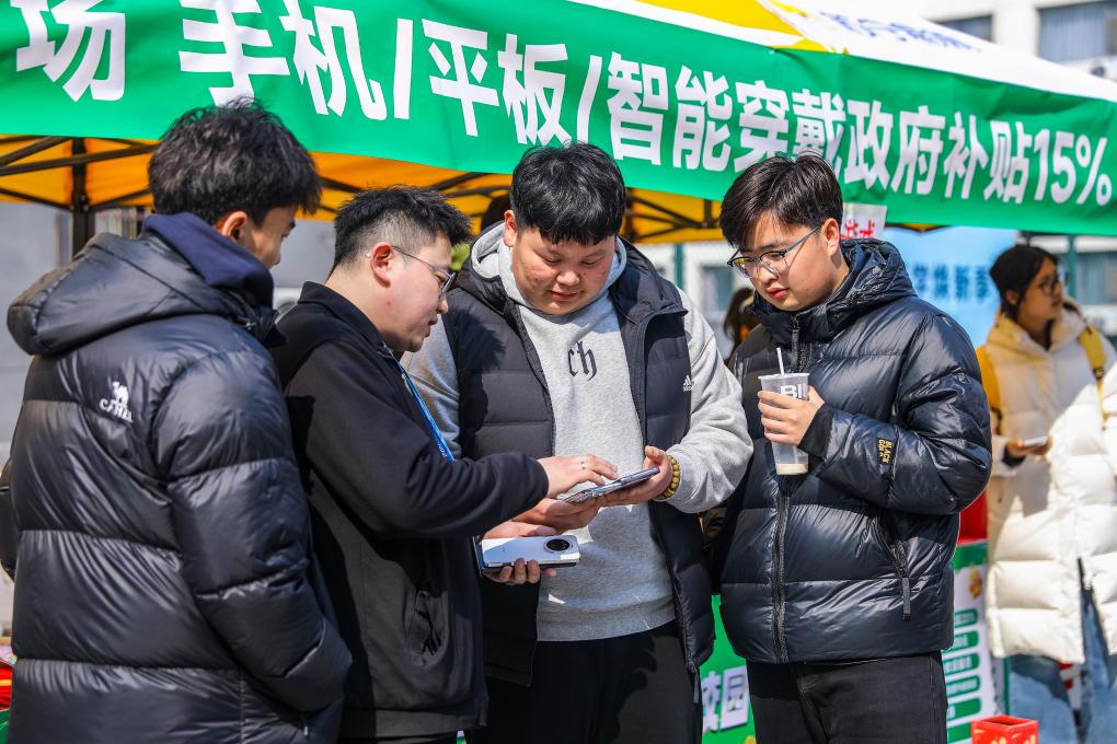 3月6日,学生在山东省青岛恒星科技学院开展的消费品以旧换新活动中选购手机。新华社发(张鹰 摄)