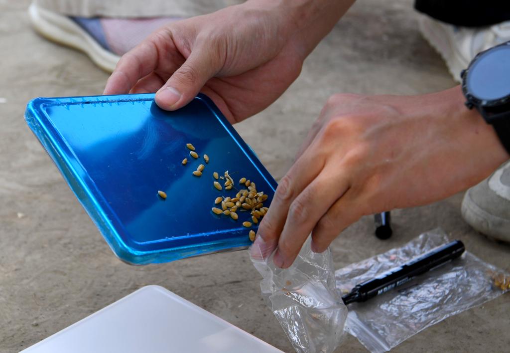 5月28日,在河南省周口市商水县举行的小麦机收减损技能大比武活动现场,工作人员将称重后的小麦倒入样品袋中。新华社记者 郝源 摄